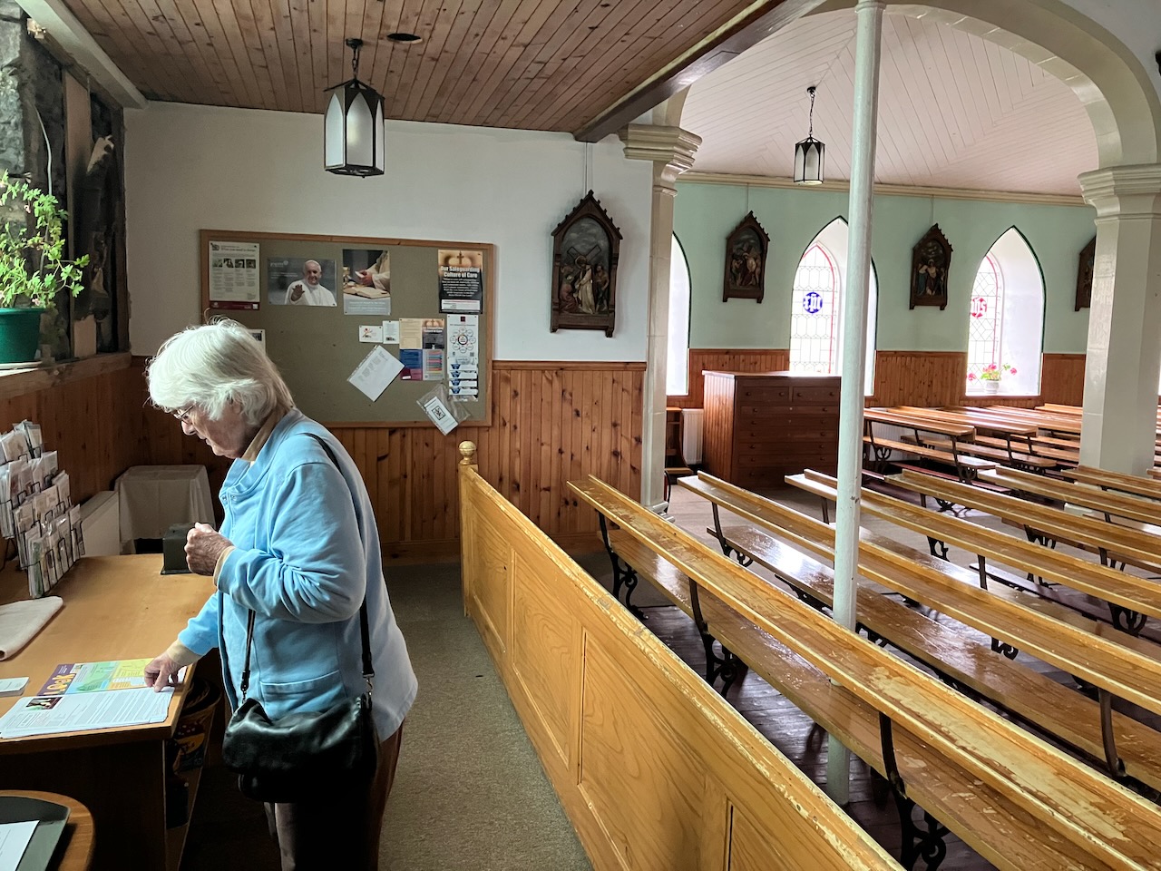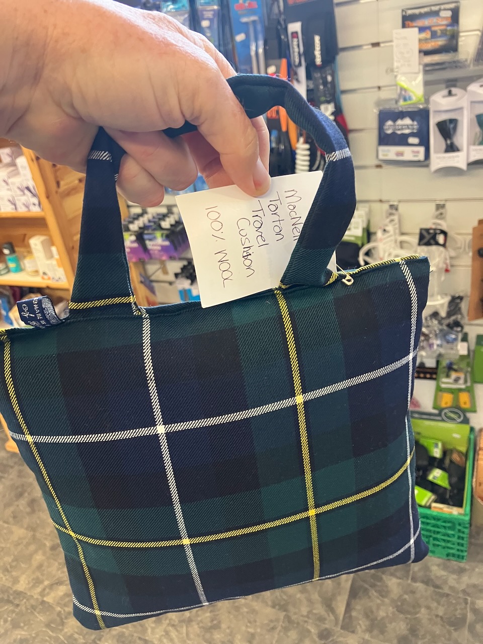 There are few places in the word where you can buy a MacNeil tartan travel pillow. BΓΉth Bharraigh, pronounced “Boo Bar Eye” is one (perhaps the only?). Omi enjoyed talking to a knowledgeable local woman there who had once had a job at the castle when it was open to the public. She was not a MacNeil but she knew all about clan MacNeil history.