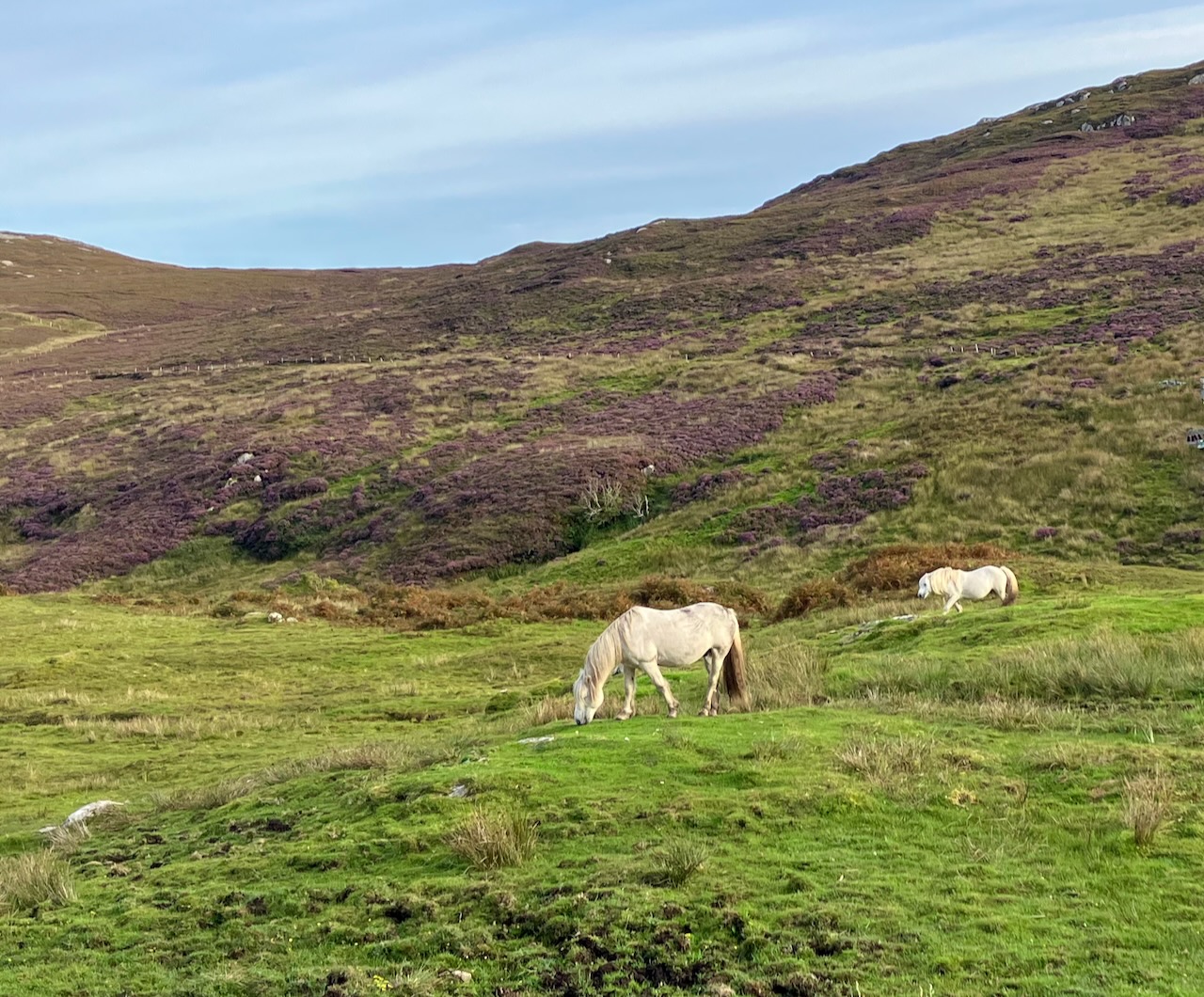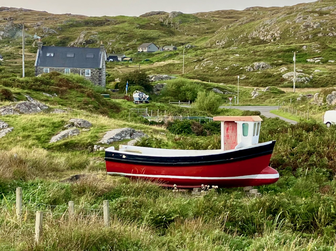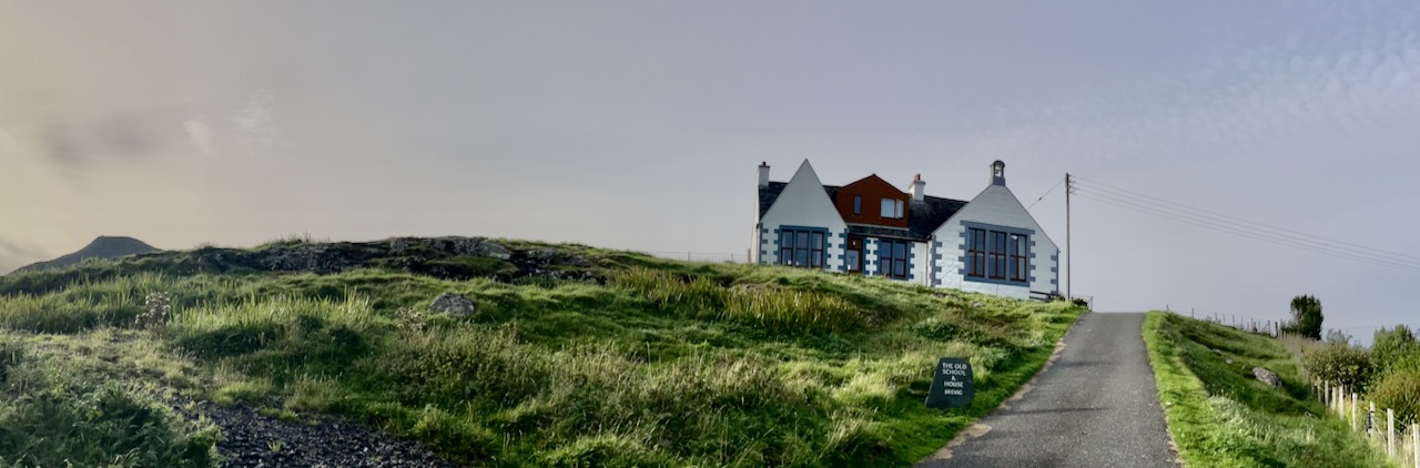 Tour with Asty. Asty regaled us with tales of his family members, many who live on the island, including a 104 year old aunt. He informed Omi that the distinctive stone houses dotting the hillsides are inhabited by year round locals, not seasonal vacationers. Historically, Barra islanders were fishermen, crofters (small scale tenant farmers raising sheep mostly). Now many work in tourism or for the ferry company, including his nephew.