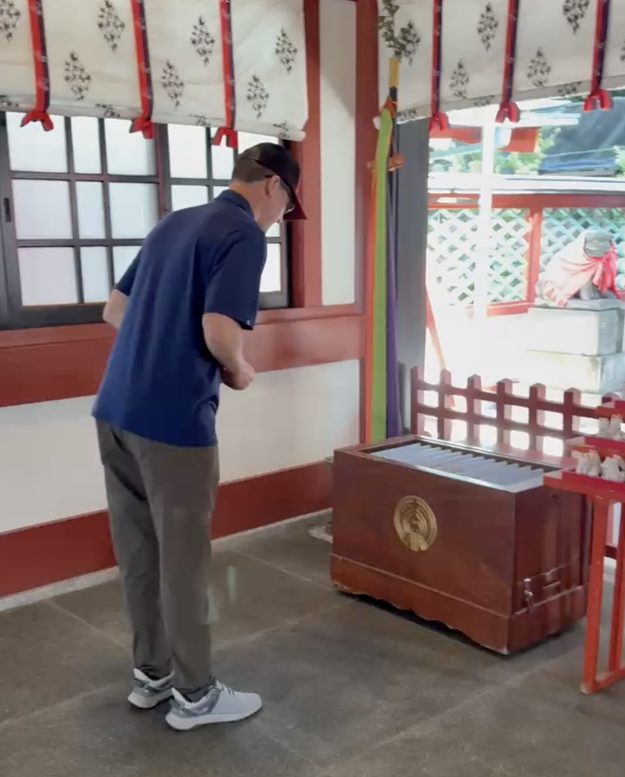 Me bowing awkwardly at Hie. I then clapped twice and tossed 50 yen in the container for good luck.