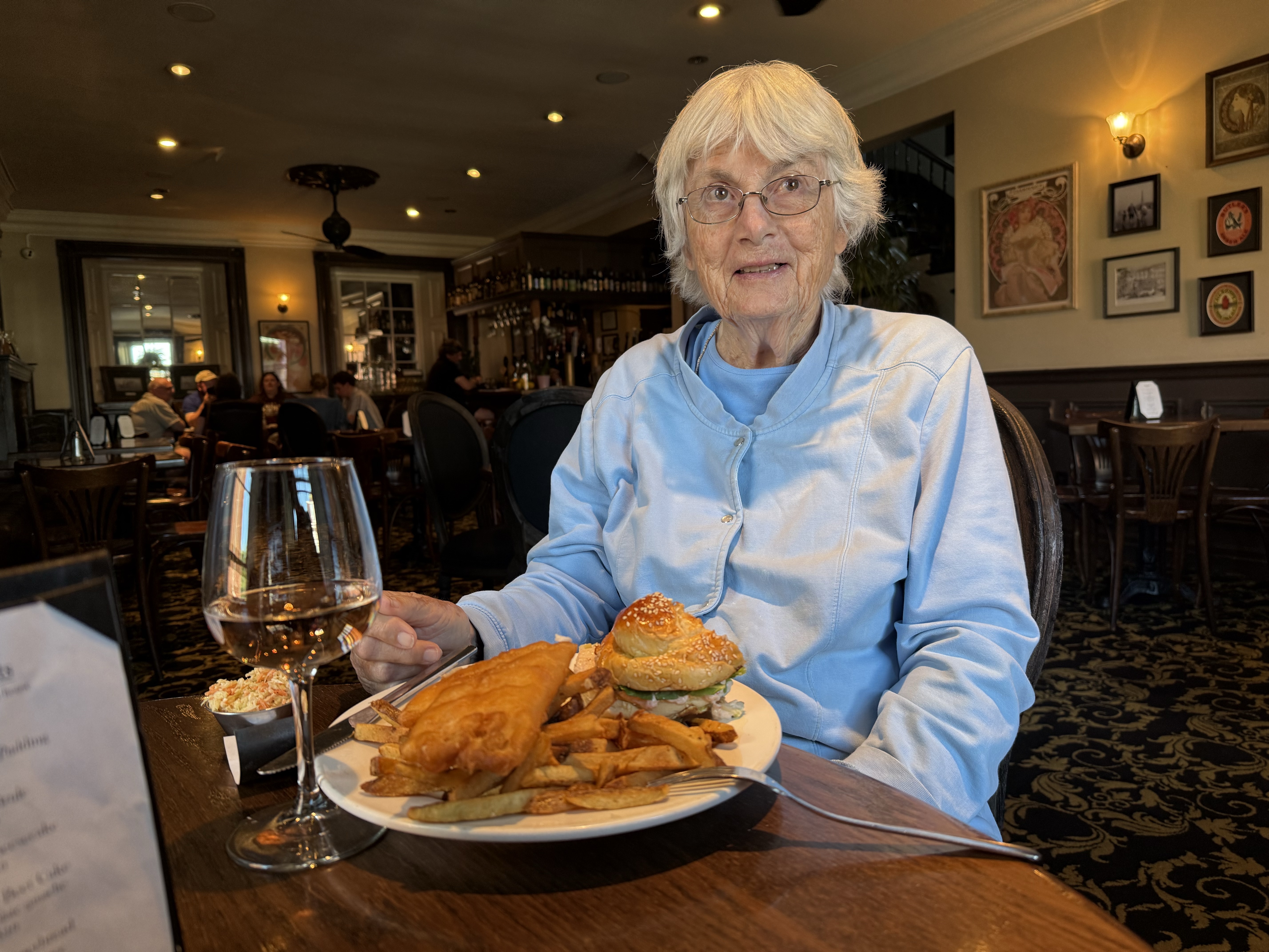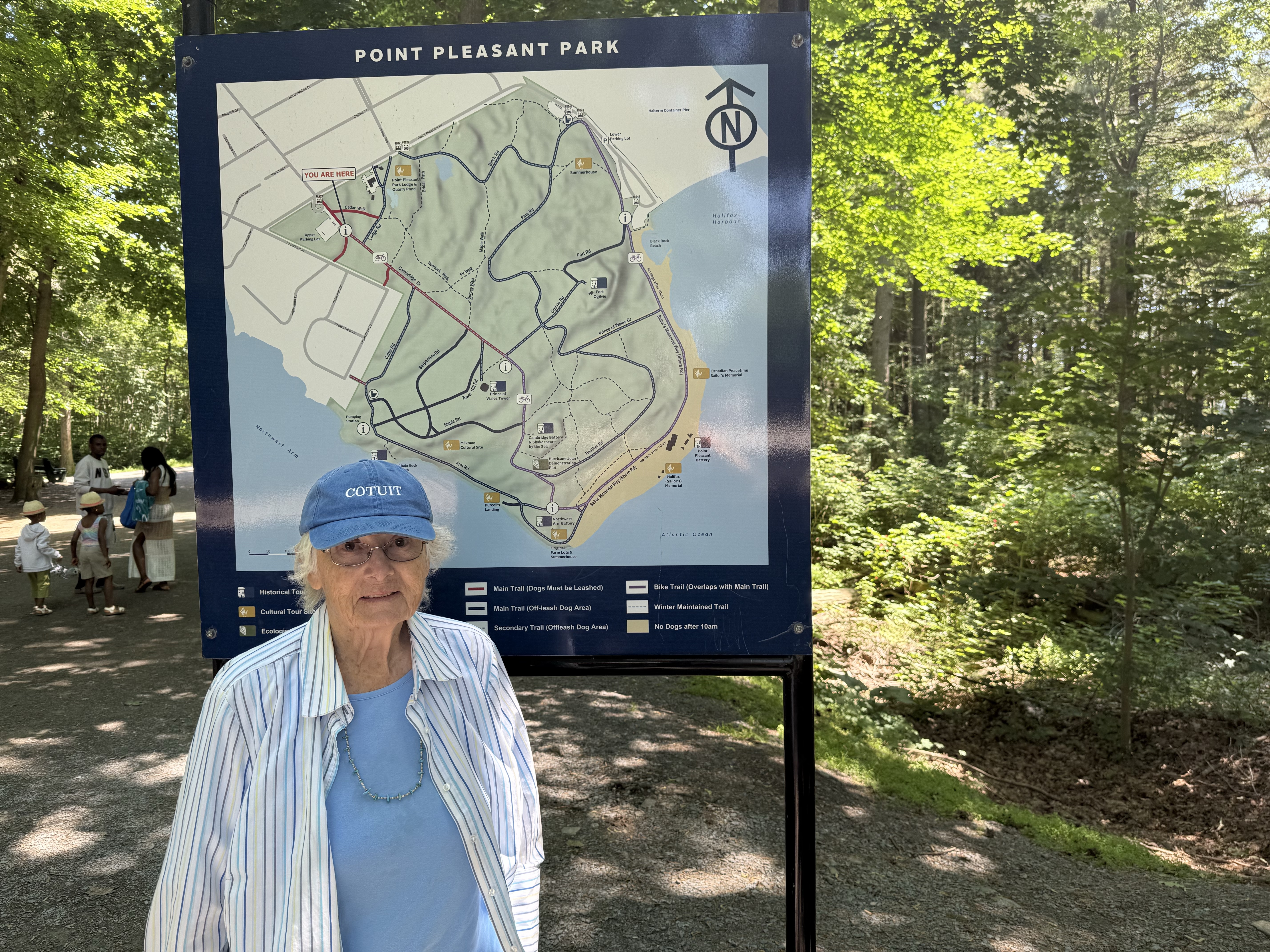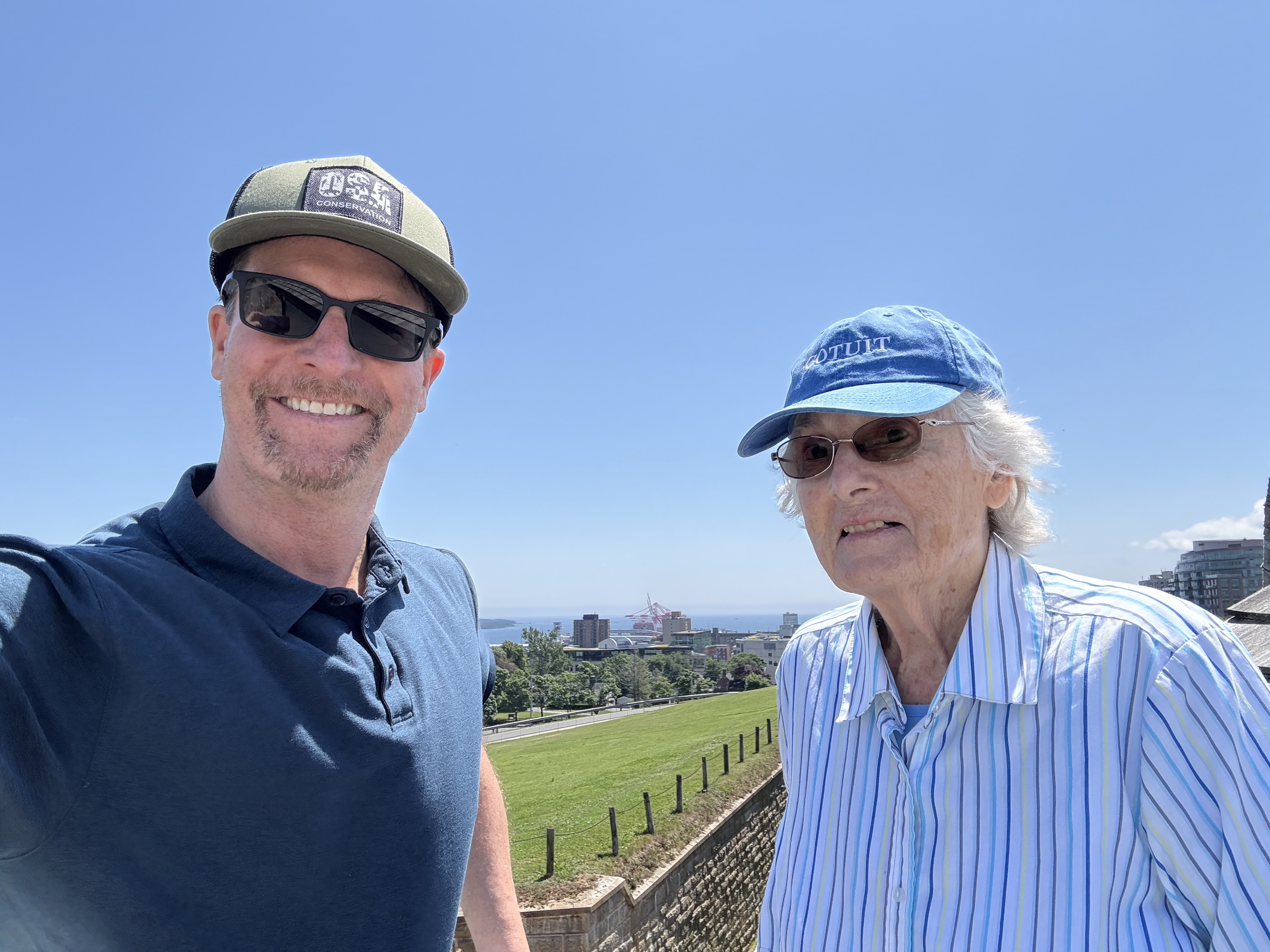 The Citadel Entrance – Omi hoped to see some mention of her great uncle Major William Borrett, who was Fletcher’s cousin and hired him to take his first job at the very first radio station in Halifax. We did not see any monument to Major Borrett, but a quick Google search revealed that he was quite an impressive guy (see bottom of page). His wife, Muriel was impressive too, and a stickler for manners. She complimented Omi on her good manners because Omi ate her food with the fork in her left hand. But Omi revealed to me that this was because she was left handed. Her sisters had glared at her as she received the compliment, since they ate in the usual American style, fork in the right hand. But no one gave away Omi’s secret. Major Borrett’s wikipedia excerpt is at the bottom of this post.Soldier showing off his rifle skills – he is representing the Highlands expeditionary force from the 1869 era at the CitadelCitadel view, with the Halifax waterfront below.Studley Avenue is the street where Omi spent the first two years of her life before the family relocated to New York City, when Fletcher got a job in Manhattan. Studley avenue is a very fancy, leafy street right next to Dalhousie University – where Fletcher studied before taking the job at the radio station CHNS-FM. We were not sure exactly which house it was, since the numbering system changed, but all the houses on the street were lovely:Omi would have explored these streets with her sisters – at least in a stroller.Fletcher and Eleanor Coates moved into one of these houses. Enjoying local fish and chips in HalifaxNice hike at the Point Pleasant Park. The day was mild, sunny and summery. The landscape leafy and sun dappled, with extensive trails and friendly dog walkers.