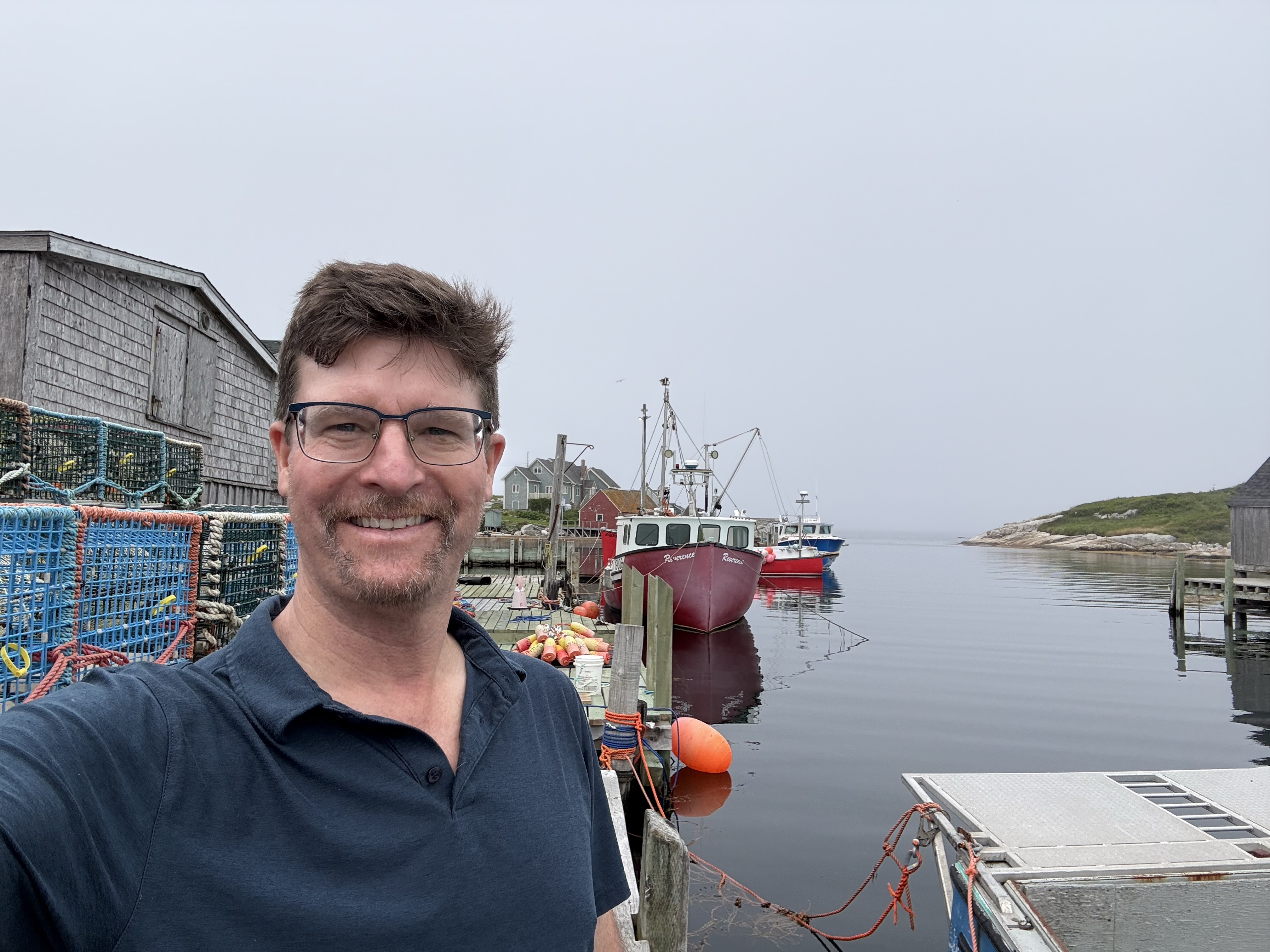 We went south from Halifax, entering a landscape of piney forests intermixed with lakes and marshes, finally giving way to a seashore of pale granite rocks and calm waters. The village was enshrouded in fog that gradually retreated from shore, revealing the fishing vessels that would be at home in Chatham – except that we were in the vibrant tourist town of Peggy’s Cove. Here is Omi on the wharf next to lobster pots in Peggy’s Cove.